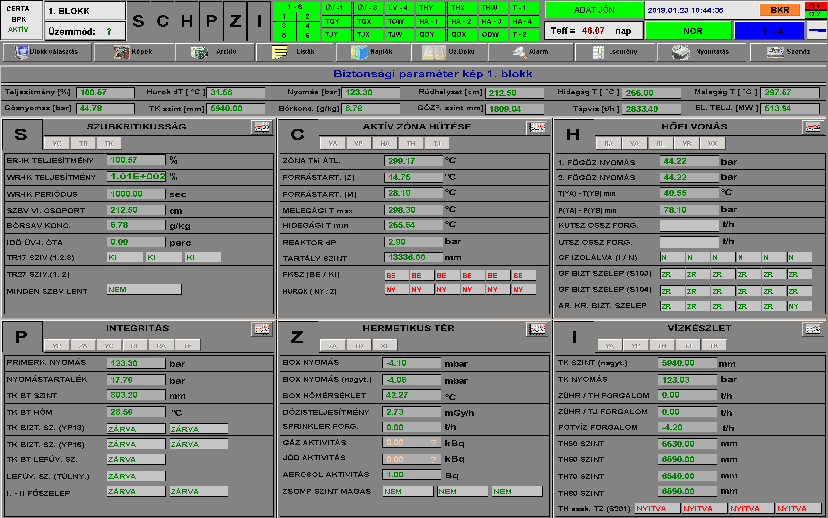 The CERTA VITA (developed by the Centre for Energy Research – CER) maintains an online data link with the units, and collects and displays 500-600 selected parameters from each of the four units of Paks NPP and optionally from the full-scope simulator (that runs the accident scenarios during exercises) with a ten second update frequency. There are four different screens of CERTA VITA to display the measured and derived data. Safety parameter display presents the most important safety related parameters of the units. Trend views are used to display any of the parameters selected by the user. The p-T (pressure-temperature) diagram displays the evolution of the cold leg and hot leg operating-points of the primary circuit. The data can also be visualized in more than 30 plant schemes.